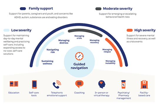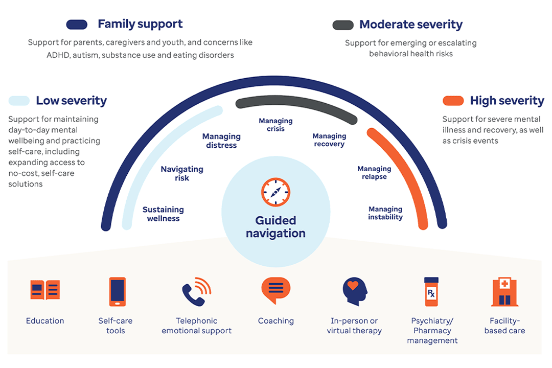 It's about going beyond traditional network approaches and expanding care options. Our solutions support members no matter their level of need, with a range of support options, from self-help tools, 24/7 in-the-moment support, and coaching for adults and youth.
